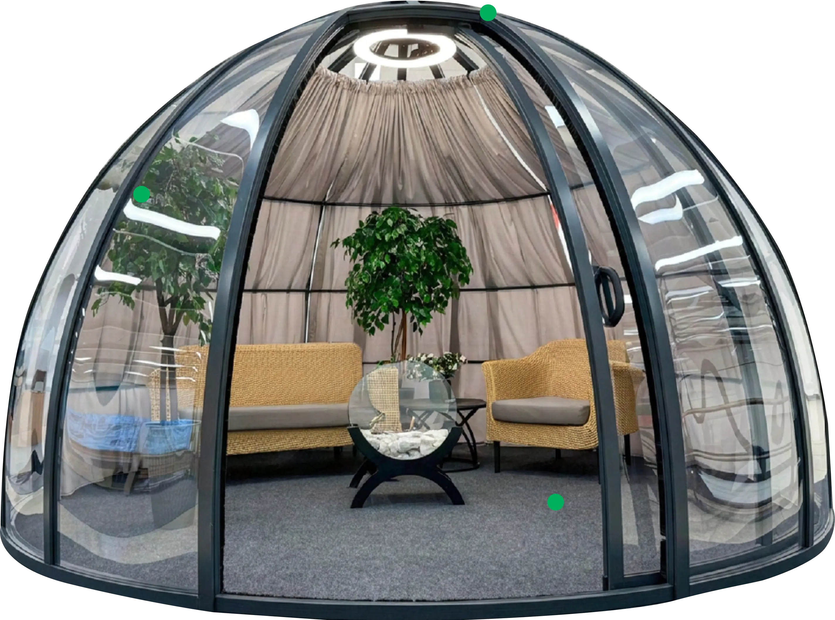 Tayanch karkas zanglamas galvanizli po‘lat profillardan tayyorlangan bo‘lib, korroziyaga chidamli va uzoq xizmat muddatini ta’minlaydi. Uning modulli tuzilmasi yig‘ish va qismlarga ajratishni osonlashtiradi. Gumbaz shakli yukni teng taqsimlaydi va shamol hamda qor bosimiga barqarorlikni ta’minlaydi.
